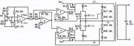 以下是一款高效率的正弦波逆變器電器圖,該電路用12V電池供電。先用一片倍壓模塊倍壓為運(yùn)放供電??蛇x取ICL7660或MAX1044。運(yùn)放1產(chǎn)生50Hz正弦波作為基準(zhǔn)信號(hào)。運(yùn)放2作為反相器。運(yùn)放3和運(yùn)放4作為遲滯比較器。其實(shí)運(yùn)放3和開關(guān)管1構(gòu)成的是比例開關(guān)電源。運(yùn)放4和開關(guān)管2也同樣。它的開關(guān)頻率不穩(wěn)定。在運(yùn)放1輸出信號(hào)為正相時(shí),運(yùn)放3和開關(guān)管工作。這時(shí)運(yùn)放2輸出的是負(fù)相。這時(shí)運(yùn)放4的正輸入端的電位(恒為0)總比負(fù)輸入端的電位高,所以運(yùn)放4輸出恒為1,開關(guān)管關(guān)閉。在運(yùn)放1輸出為負(fù)相時(shí),則相反。這就實(shí)現(xiàn)了兩開關(guān)管交替工作。